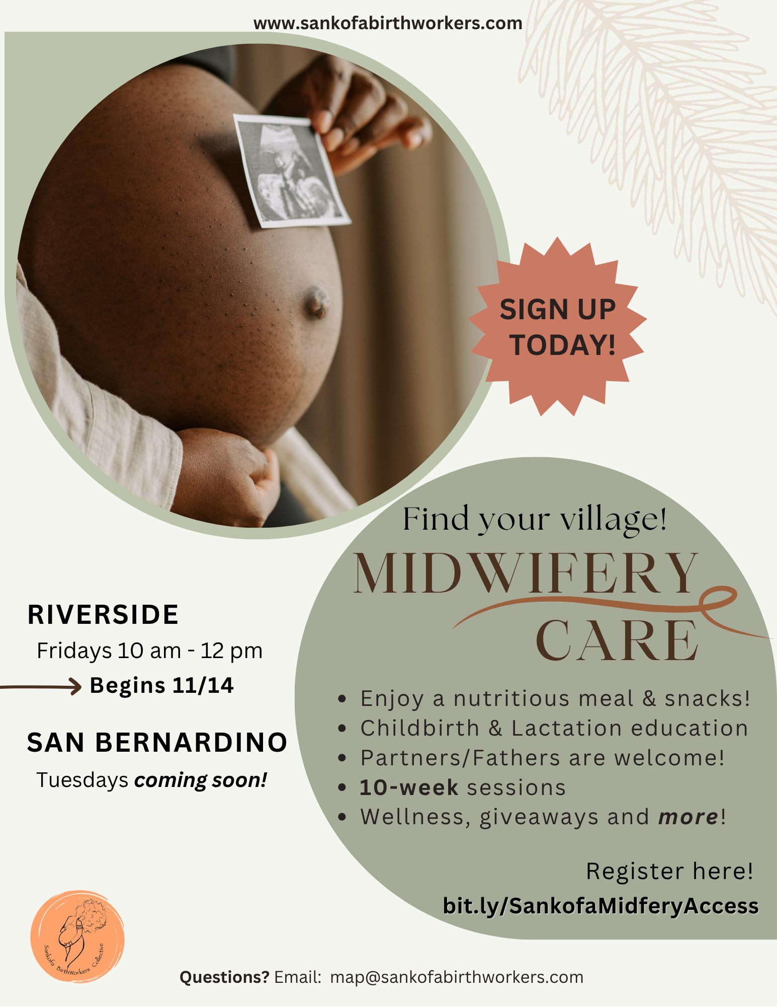 Black families in Riverside & San Bernardino counties can apply for no-cost doula services* through the grant-funded Sankofa Community Doula Program.